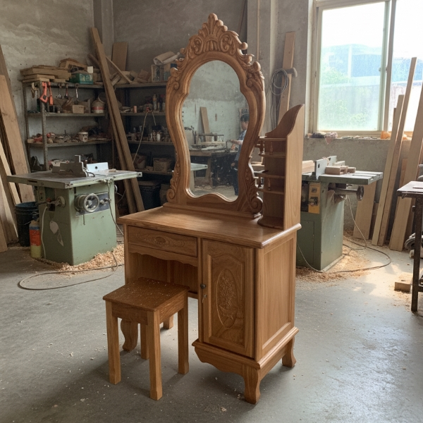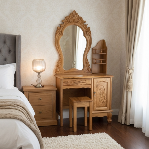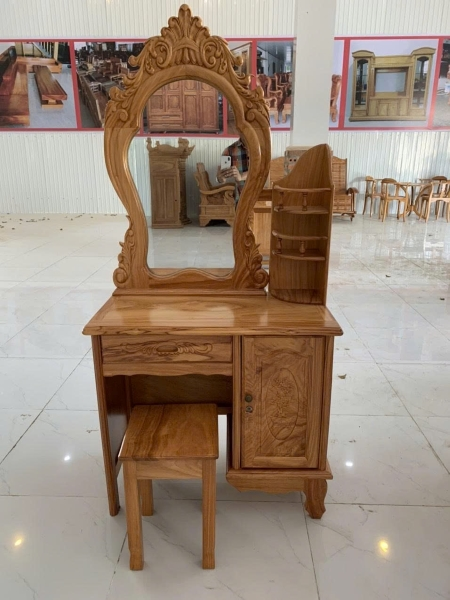 Bàn trang điểm gỗ tự nhiên BNTD01 với thiết kế cổ điển sang trọng, nổi bật nhờ các đường chạm khắc tinh tế và gương lớn viền gỗ uốn lượn mềm mại. Sản phẩm đi kèm ghế ngồi đồng bộ, mang lại sự tiện nghi và đẳng cấp cho không gian phòng ngủ.