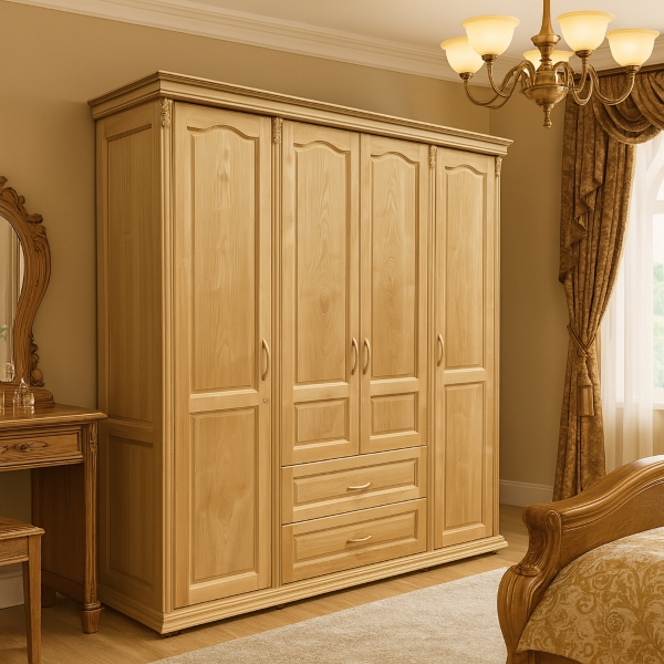 Tủ áo gỗ tự nhiên 4 cánh TUAO02 với thiết kế sang trọng, rộng rãi, gồm nhiều ngăn treo và ngăn kéo tiện dụng, giúp sắp xếp quần áo gọn gàng và ngăn nắp. Phù hợp cho không gian phòng ngủ hiện đại và cổ điển.